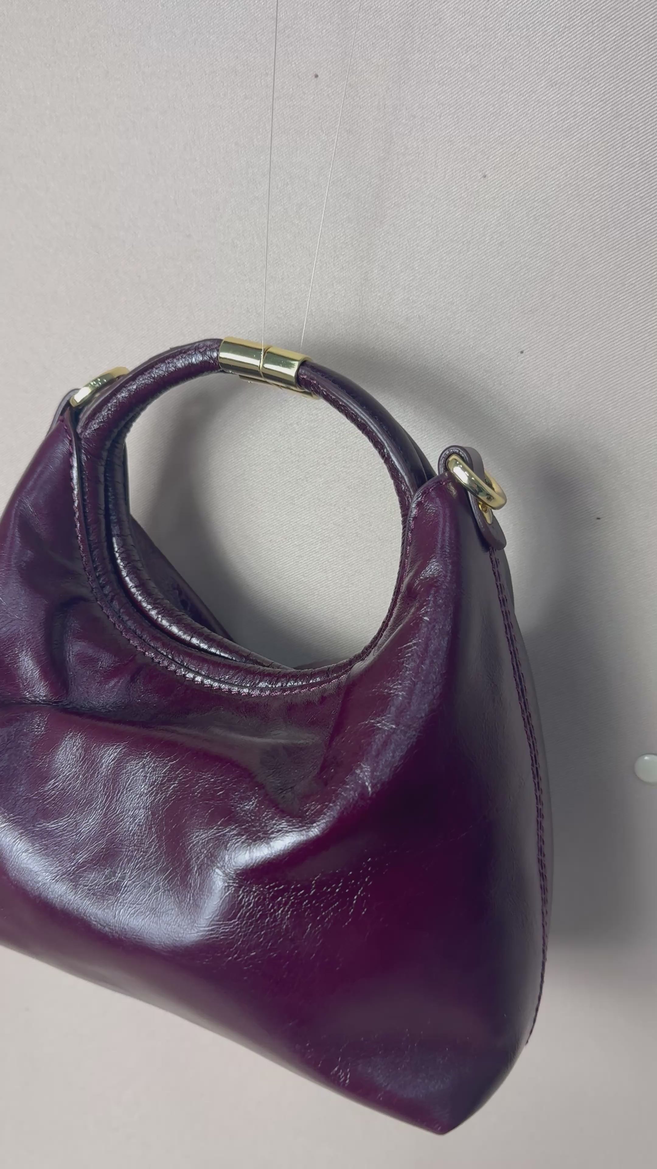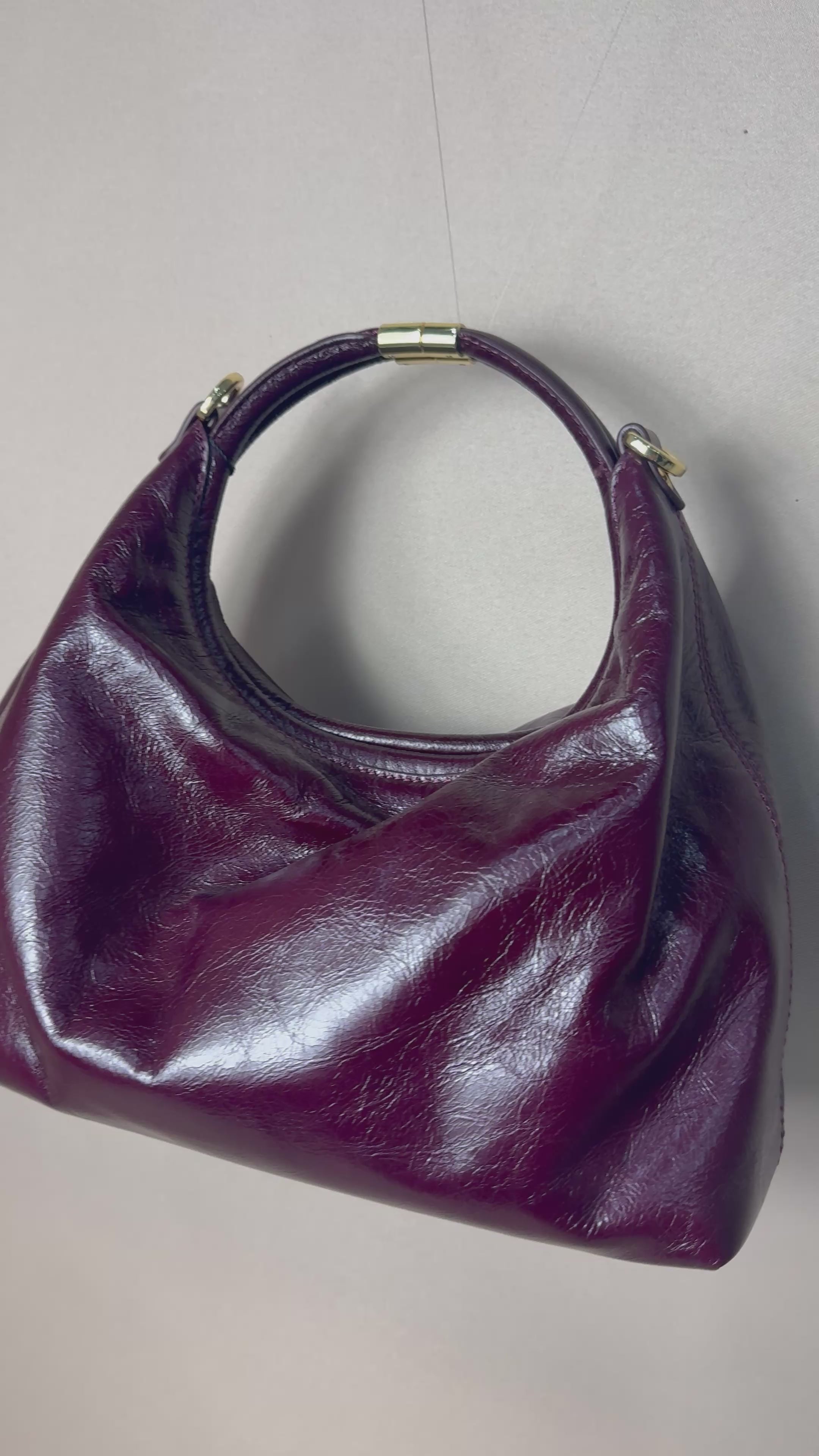 Eleganza contemporanea e design innovativo si incontrano in Luna Bordeaux, la nuova borsa A I C che si distingue per la sua silhouette a mezzaluna e il manico ad anello. Realizzata in pelle lucida bordeaux, è un accessorio compatto ma d’impatto, perfetto per look da sera o da evento. Il dettaglio dorato sulla chiusura esalta il suo stile ricercato.