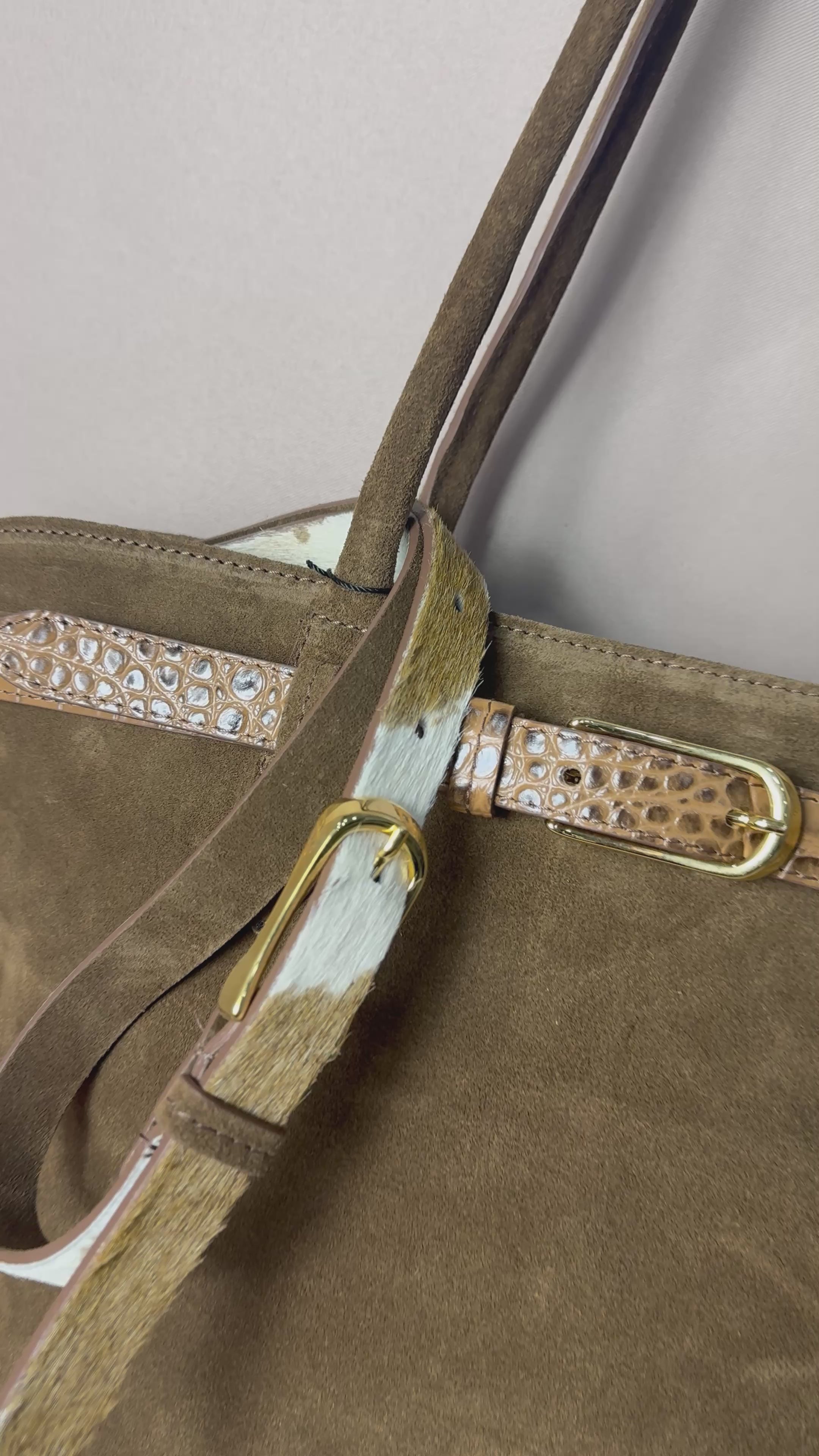 Questa borsa Vittoria, realizzata in camoscio di alta qualità, è perfetta per chi ama la versatilità. Con una cintura intercambiabile, è disponibile in due misure per adattarsi alle tue esigenze. Scegli il comfort e il design decisi con stile e classe.